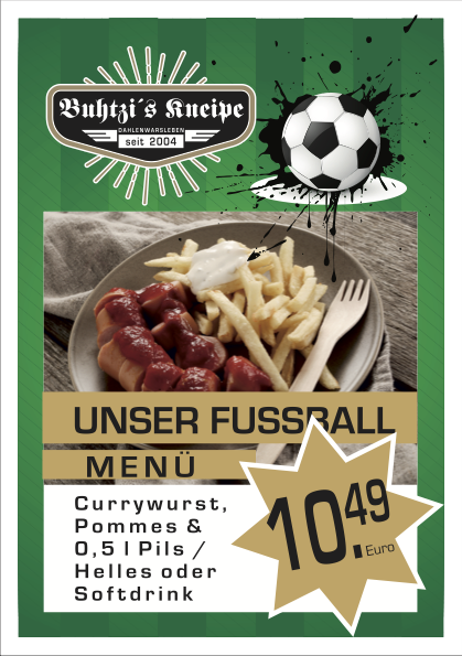 Wenn ein Spiel läuft, gibt’s bei uns die ideale Stärkung: Eine knackige Currywurst mit frisch frittierten Pommes, dazu 0,5 l kühles Pils oder Helles – alternativ ein Softdrink deiner Wahl.