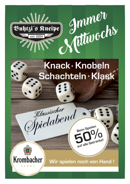 Jeden Mittwoch gehört der Abend den Karten, Würfeln und Brettspielen. Bei mir wird noch von Hand gespielt: Knack, Knobeln, Schachteln und Klask sorgen für einen geselligen Wettbewerb am Tisch. Während des Spiels erhältst du 50 % Rabatt auf alle Getränke. Der Spieleabend ist ideal für Gruppen, Stammgäste oder alle, die neue Bekanntschaften in der Kneipe knüpfen möchten.